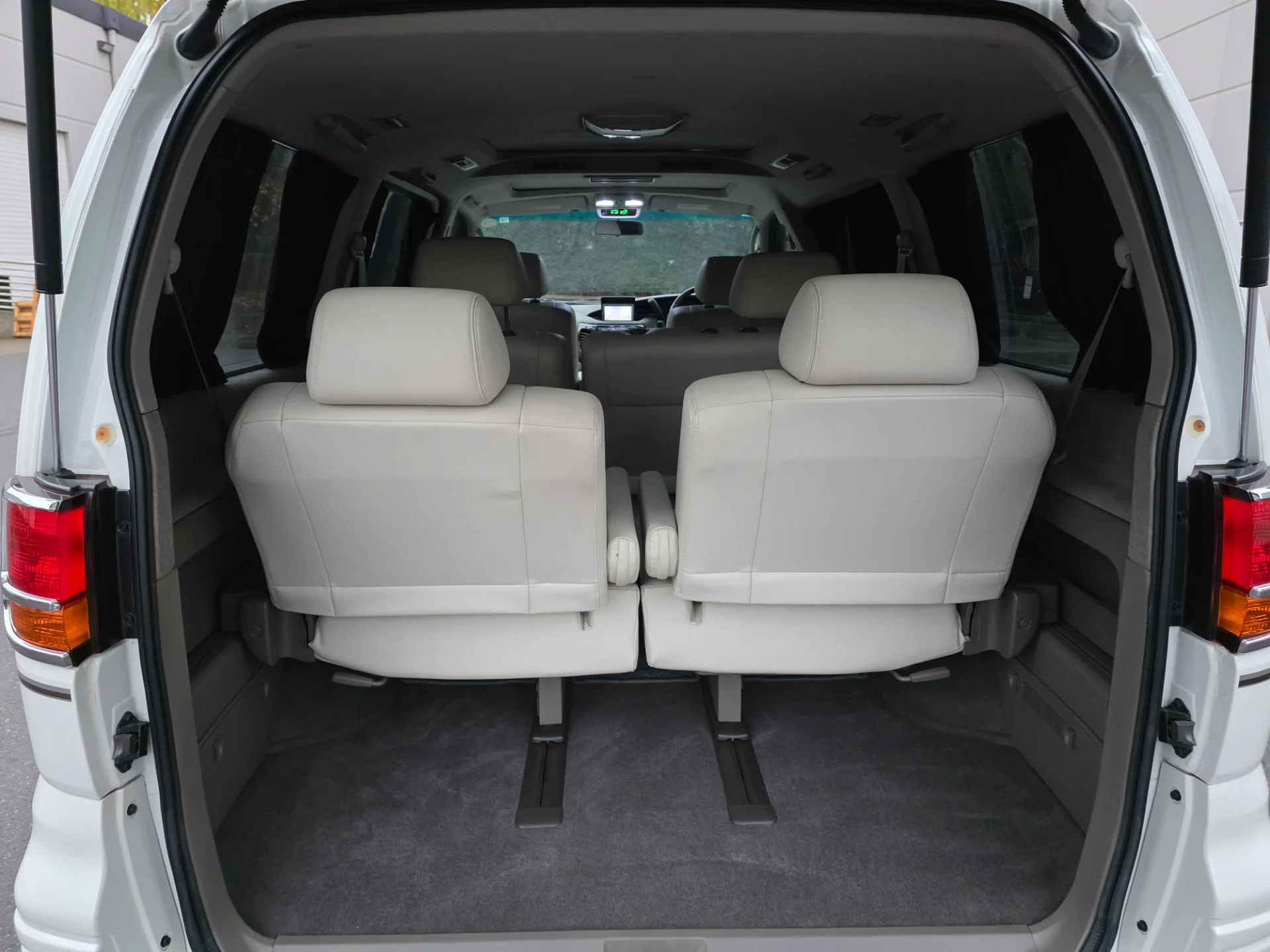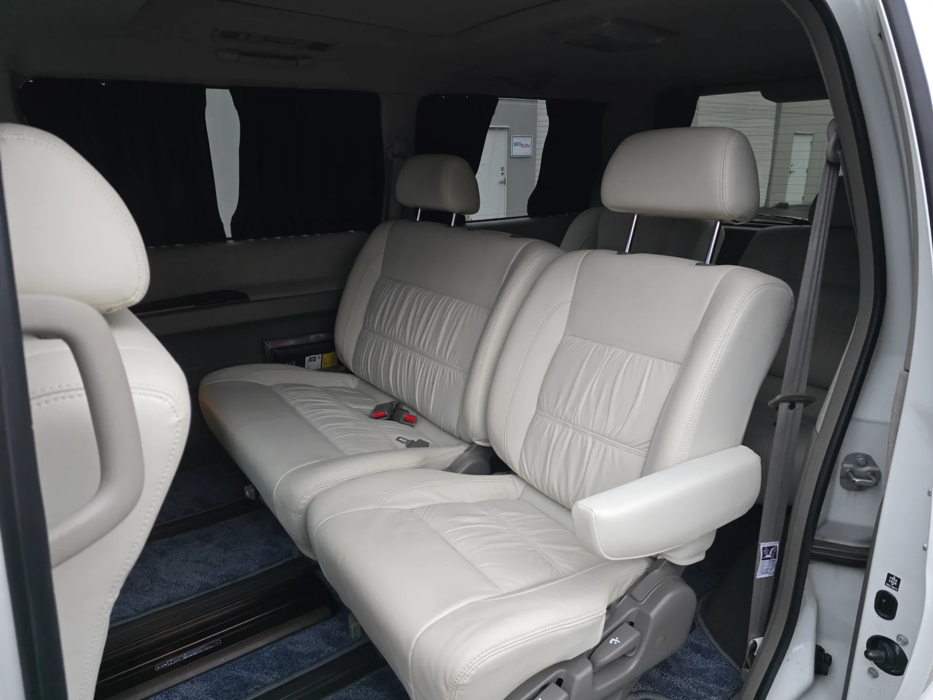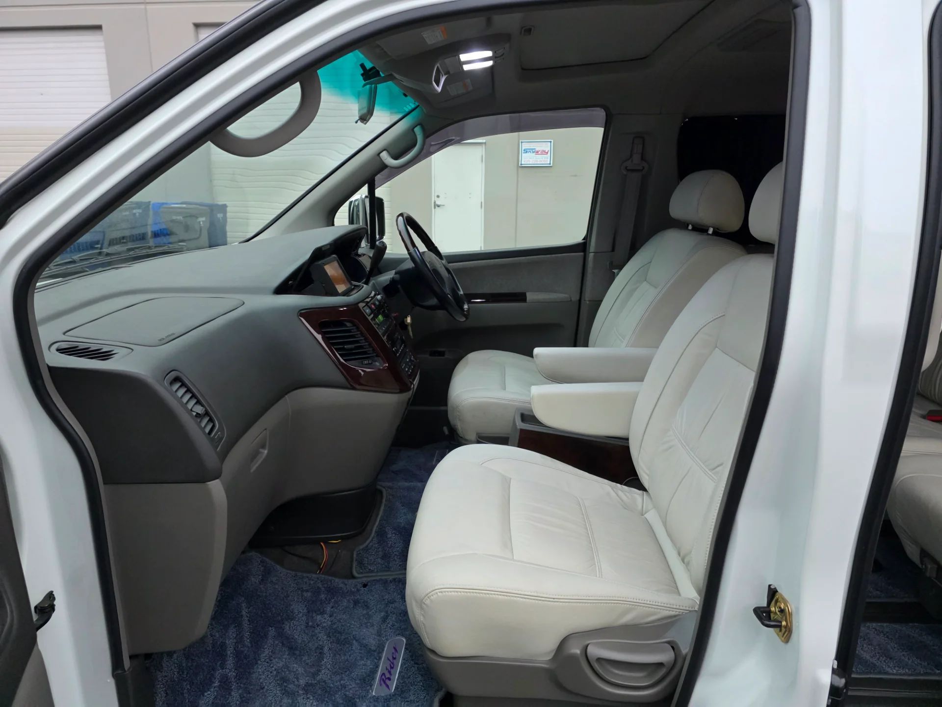 Finished in stunning White Mica / Pearl Tri-Coat over a rare white leather interior, this Rider Elgrand offers 8-passenger seating, a lounge-style swivel middle row, dual sunroofs, and premium VIP features—making it one of the most desirable configurations available.