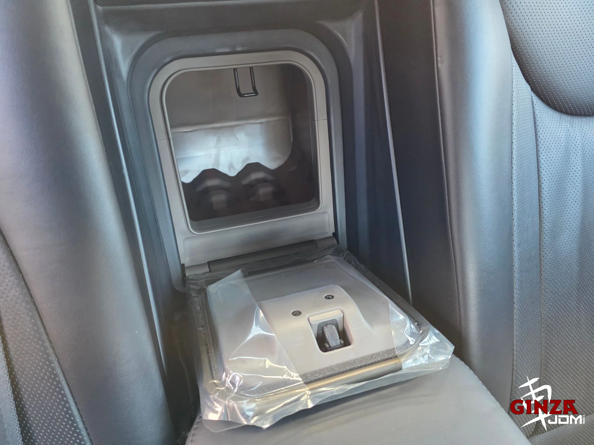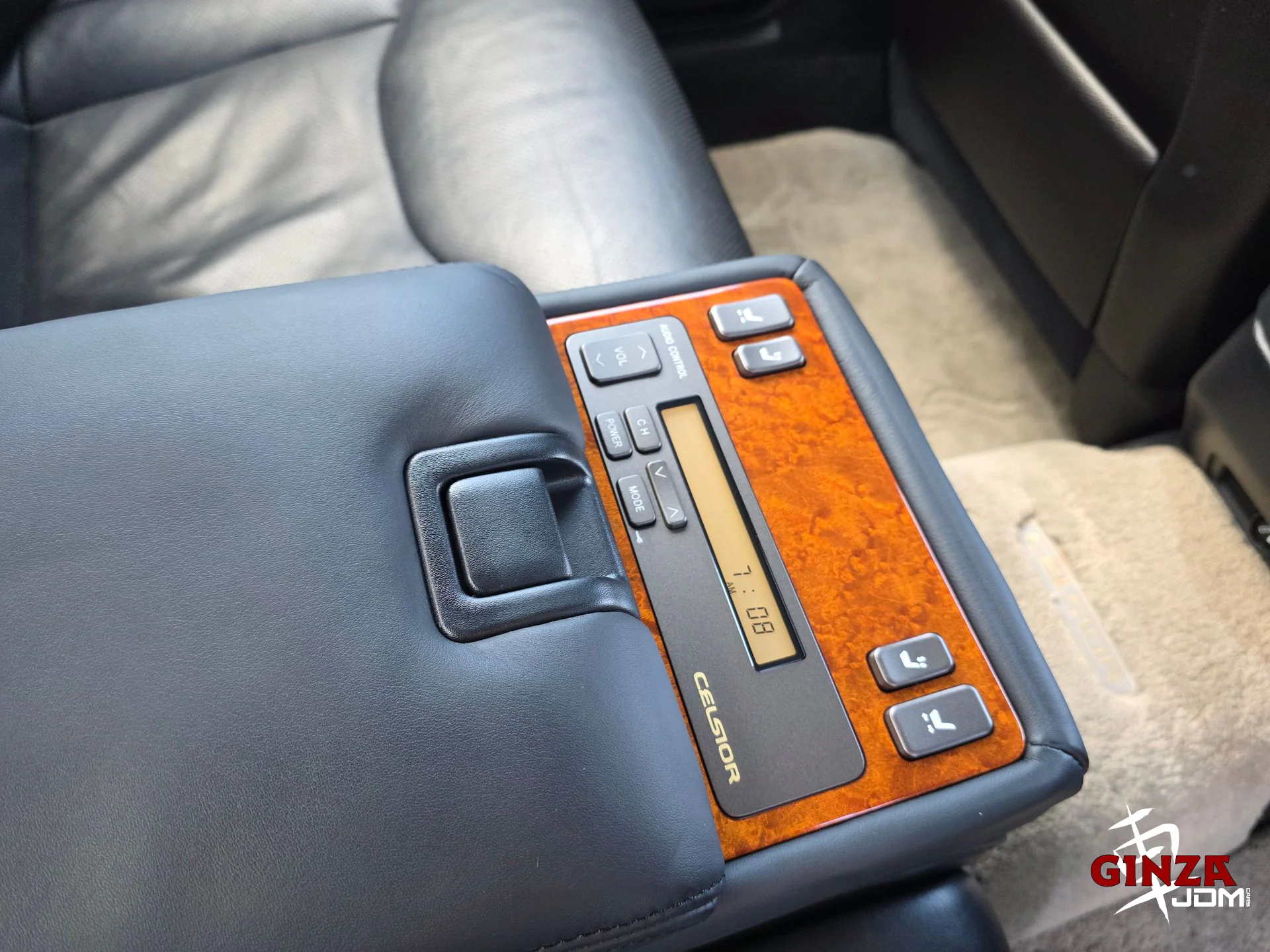 Rear passenger luxury amenities including rear cooler box (integrated refrigerated storage for drinks/snacks – a rare JDM chauffeur-grade option)